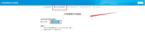 第五步:可點擊【我要清算申報】申報完成后,可點擊⑤或下一步按鈕再次進(jìn)入注銷預(yù)檢,對未辦結(jié)事項進(jìn)行檢測,如果沒有未辦結(jié)事項,則可以進(jìn)行注銷。